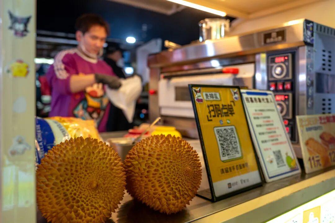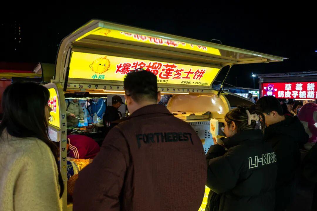 蝦龍圩夜市也有不少甜品攤,主打一個甜鹹永動。這家榴蓮芝士餅的攤主很年輕,攤位上架着一臺看起來就很貴的烤箱。