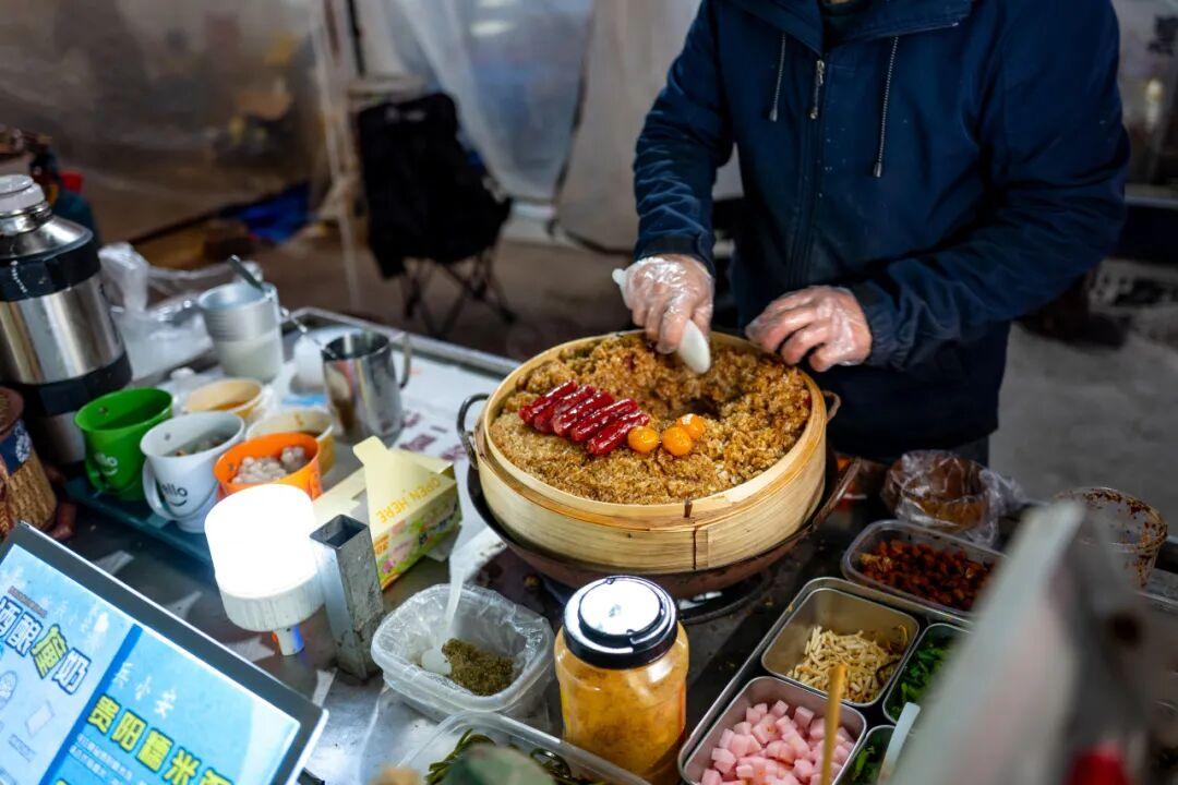蛋包洋芋攤位邊上,是貴州糯米飯,實話說我想不明白,誰大晚上喫糯米飯這麼頂飽的玩意,但沒想到這家攤子生意還挺好的。睡前也不用聽白噪音助眠了,喫個糯米飯妥妥暈碳。