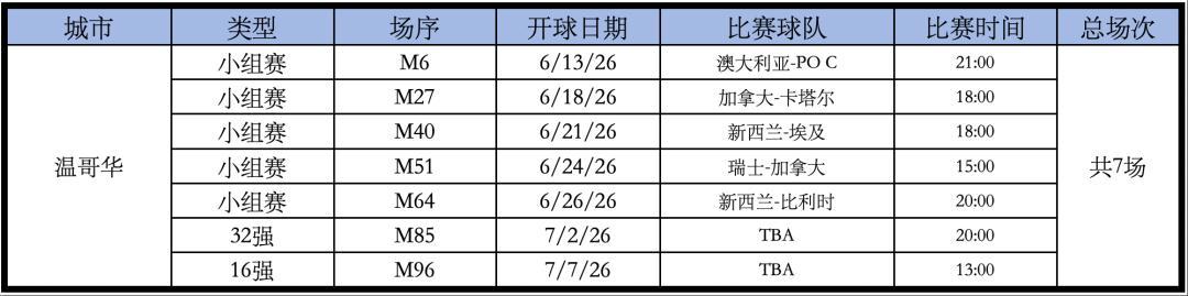 BC Place體育場的比賽如下,總共7場。