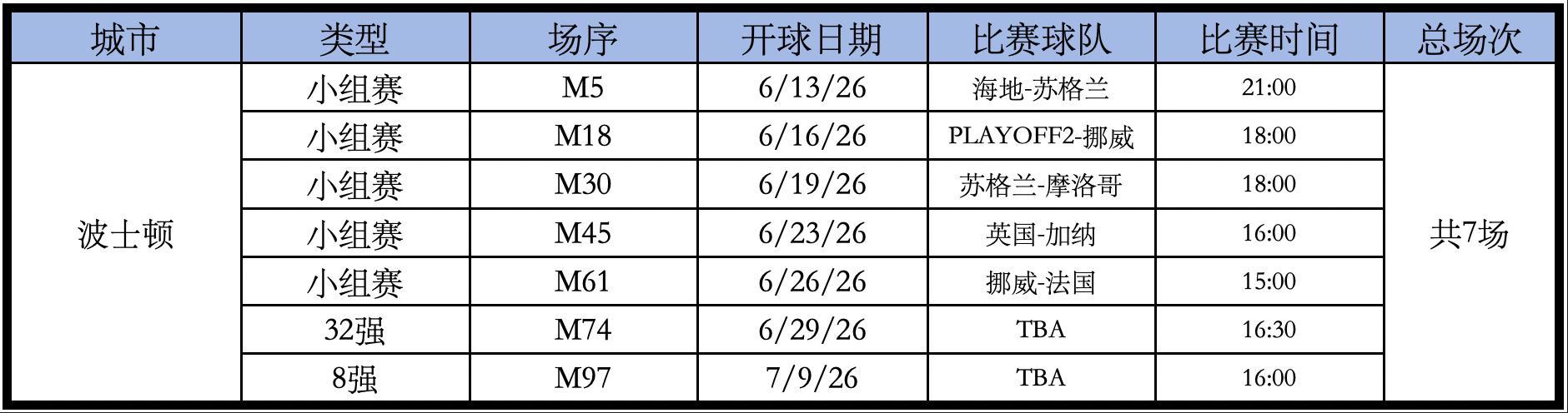 Gillette Stadium體育場的比賽如下,總共7場。
