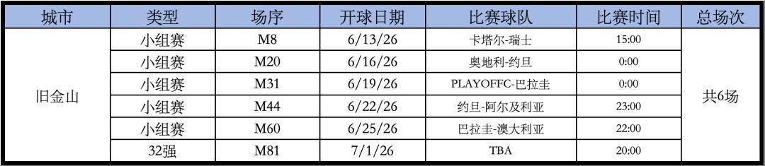 Levi’s Stadium體育場的比賽如下,總共6場。