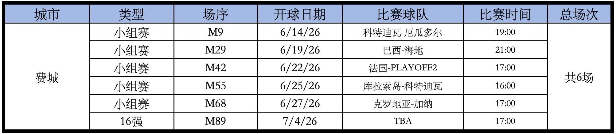 Philadelphia Union體育場的比賽如下,總共6場。