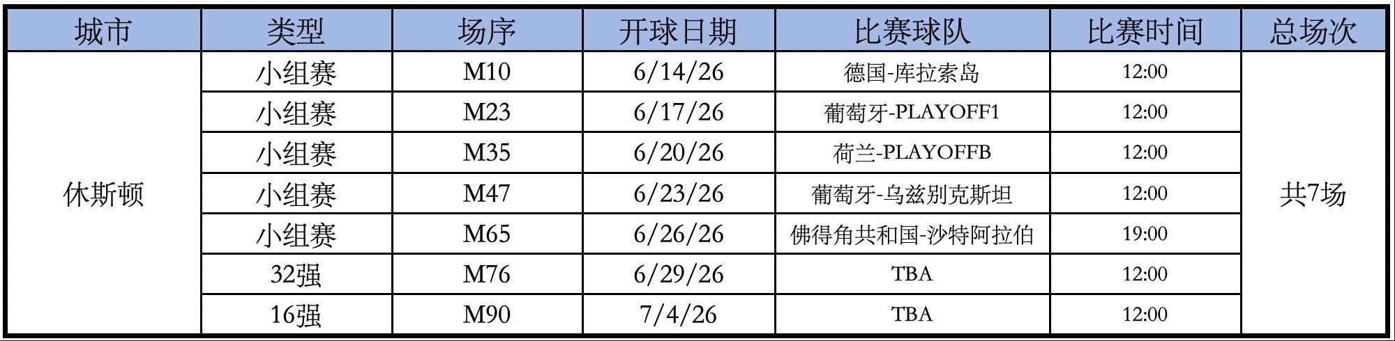 NRG Stadium體育場的比賽如下,總共7場。