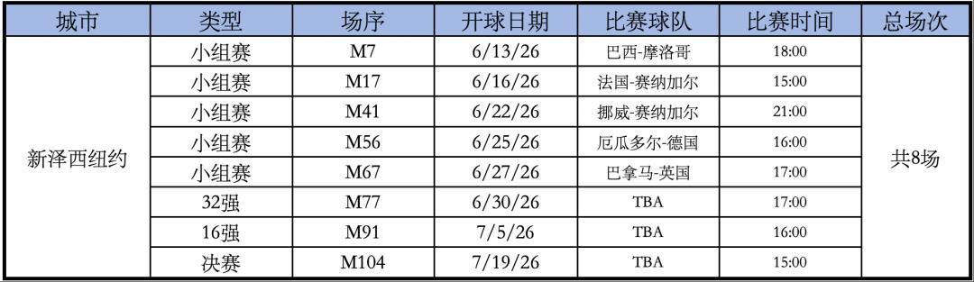 MetLife Stadium體育場的比賽如下,總共8場。比賽時間是當地時間。
