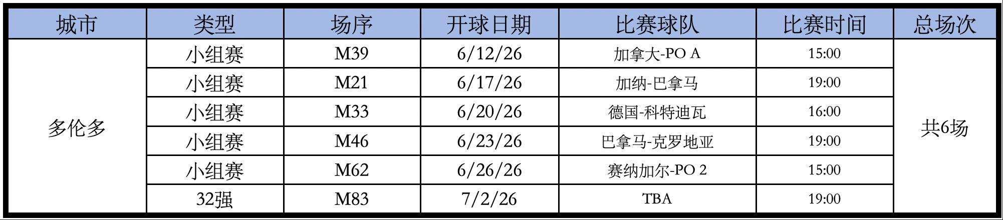 BMO Field體育場的比賽如下,總共6場。
