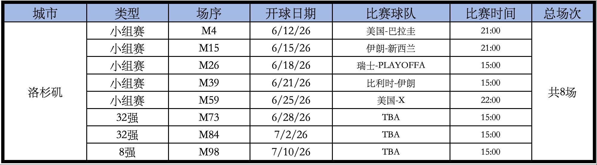 SoFi Stadium體育場的比賽如下,總共8場。