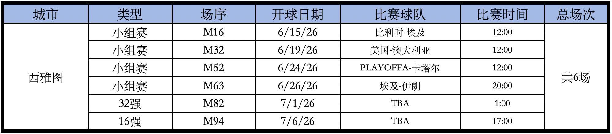 Seattle’s Lumen Field體育場的比賽如下,總共6場。