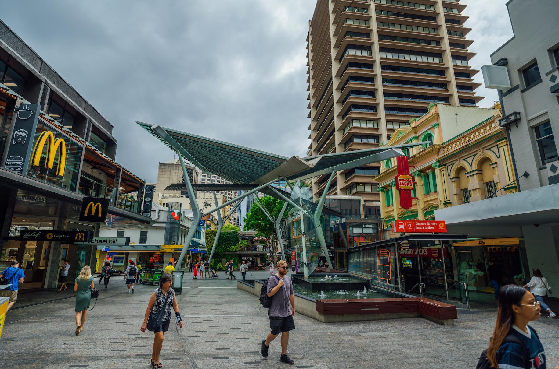皇后購物中心是布里斯班最熱鬧的商業街,所有的店鋪基本是沿着中間十字型Queen Street Mall和Albert Street分列排布,從世界級高奢精品到澳洲本土品牌,很全。