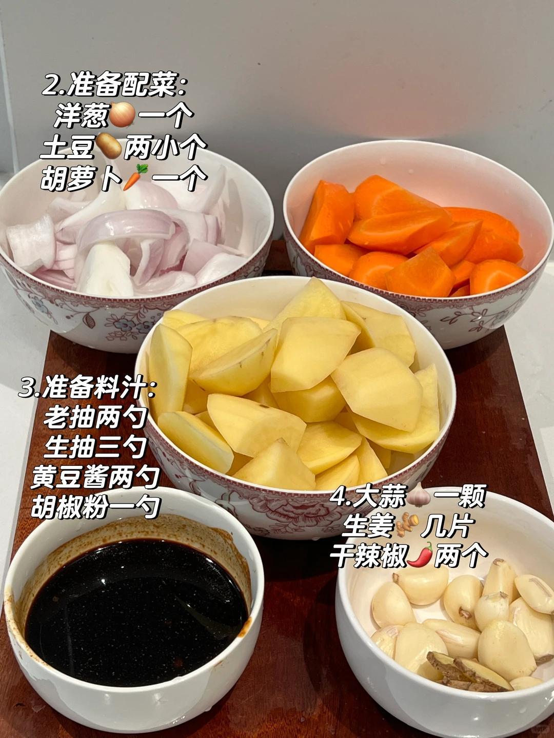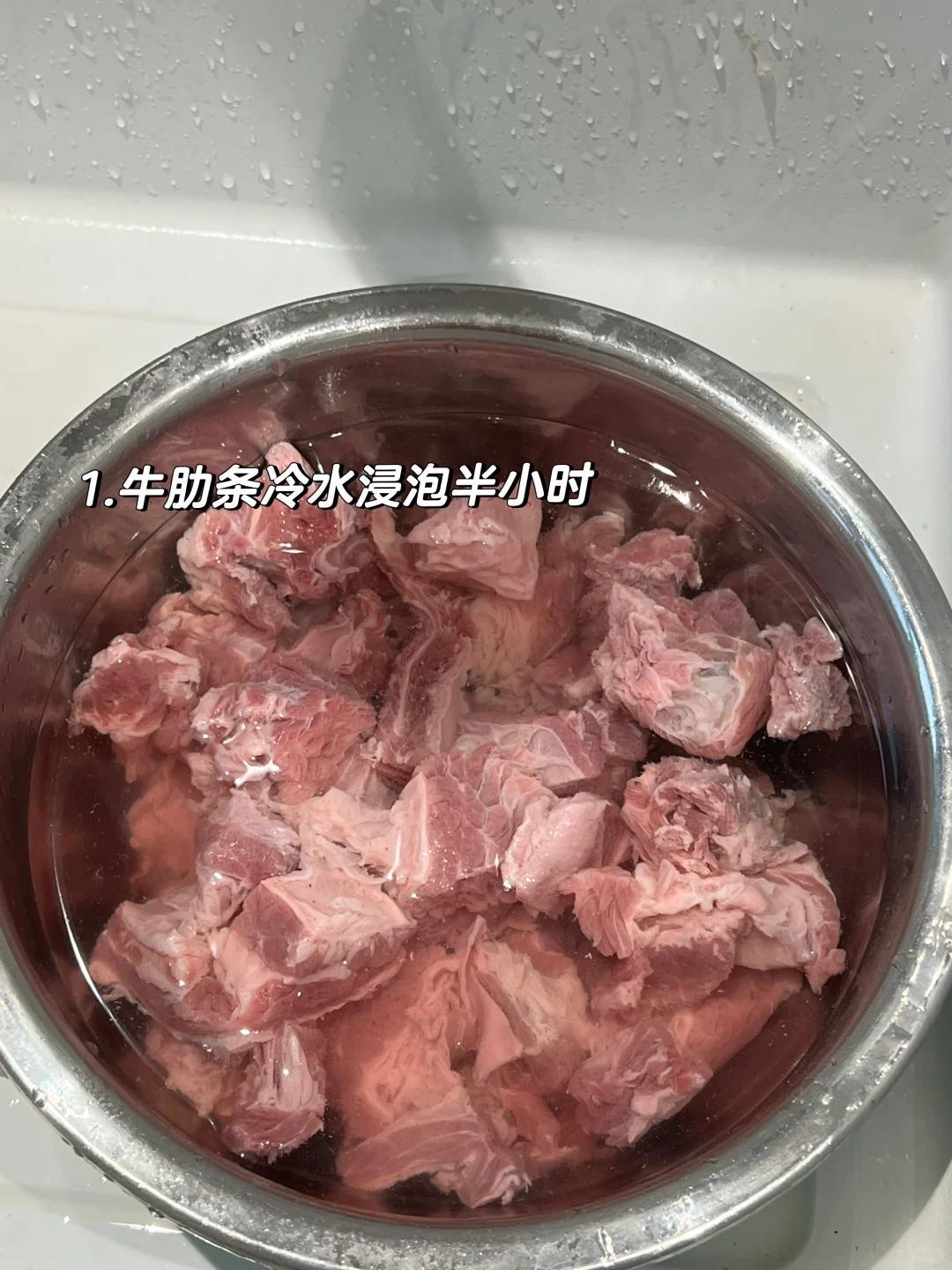 食材:牛肋條500克、冰糖5顆、八角1個、生抽、老抽、生薑。