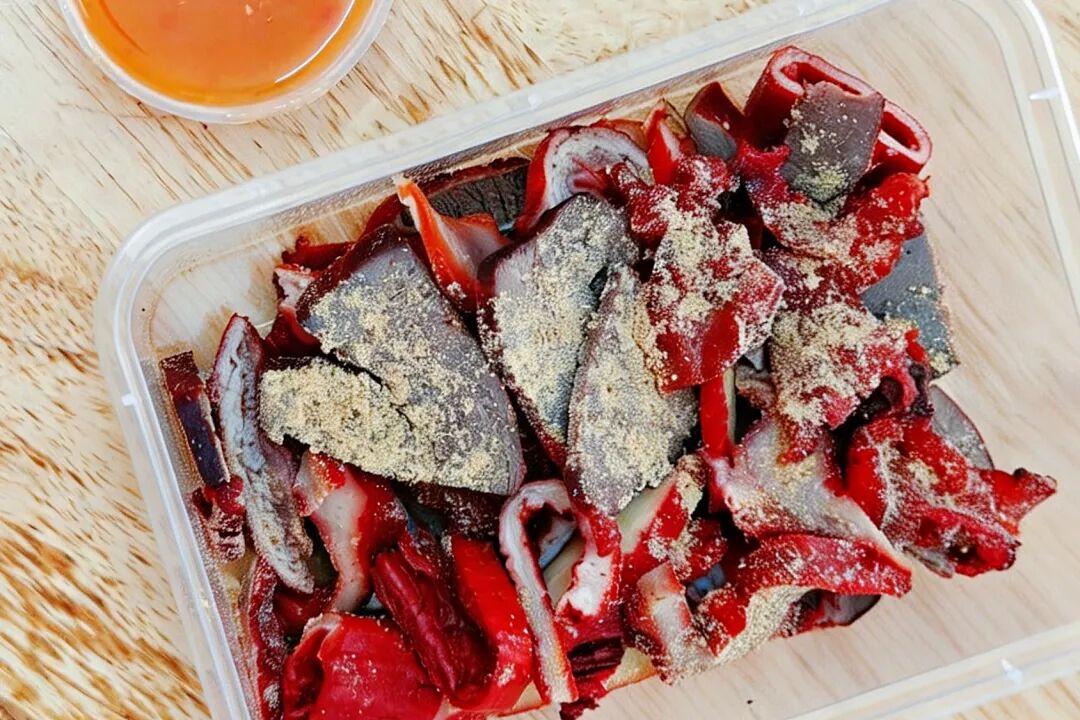 蘸的辣醬是那種類似泰式甜辣醬的甜口醬,牛雜上面撒了花生粉。不過我不太喫得慣幹牛雜,屬於說不上好不好喫,但是挺有當地特色的。
