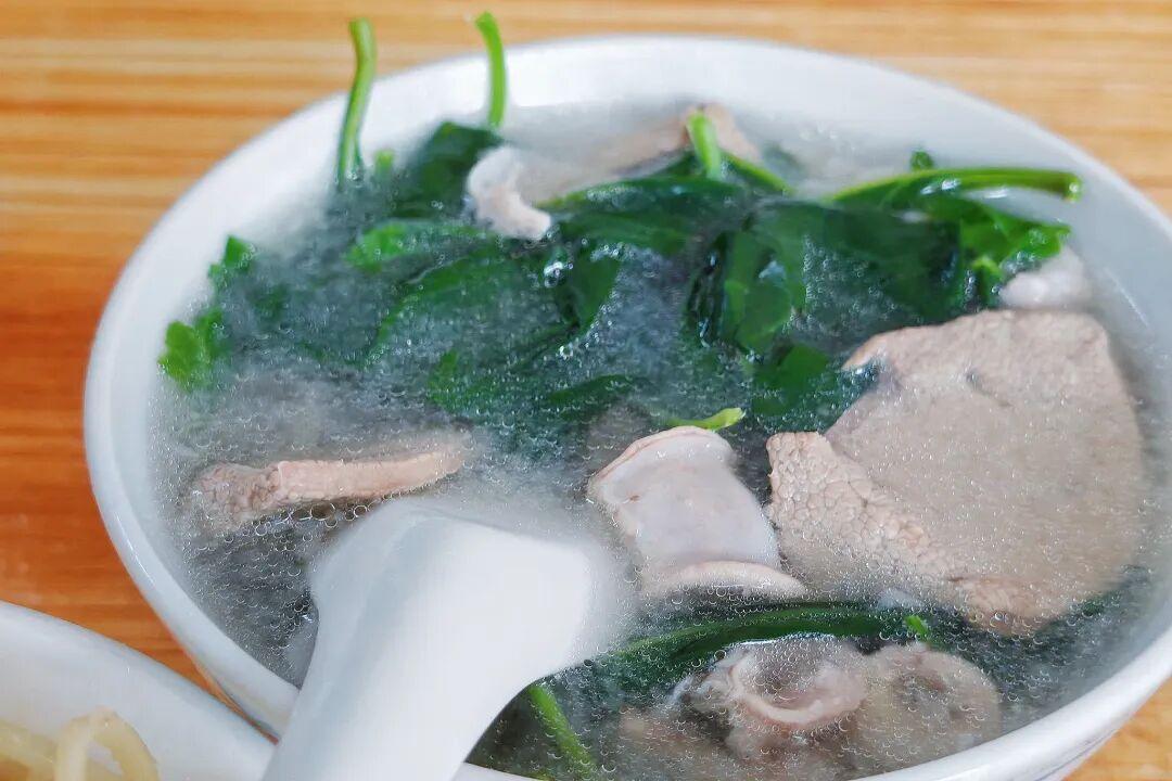 不過這家的全豬湯是五及第湯,裏面的料更多更全,雖然很多豬雜,但是不腥,搭配鮮嫩的枸杞葉,湯鮮味美,不太油膩。