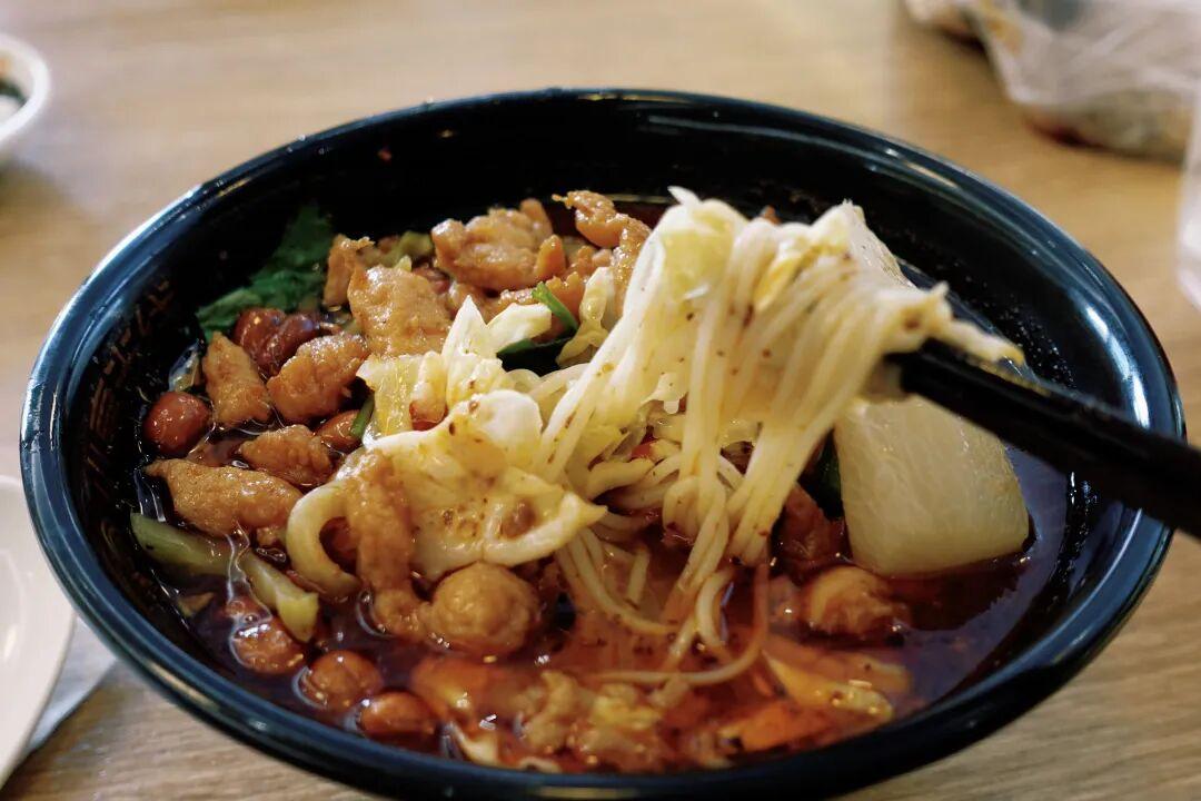 以招牌紅油雞丁米線爲例,雞丁不僅飽滿大塊,而且加了各種香料滷過,香辣帶給味蕾上最直接的刺激,這個胃口一開就關不上了。