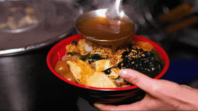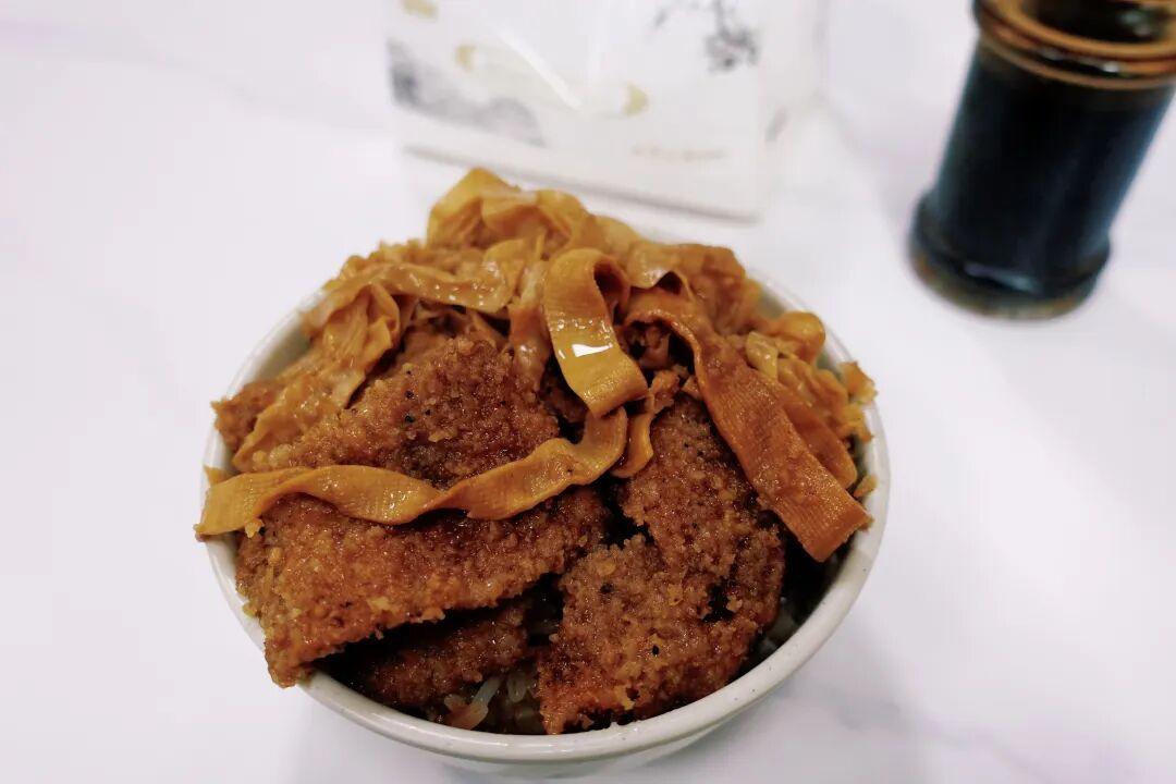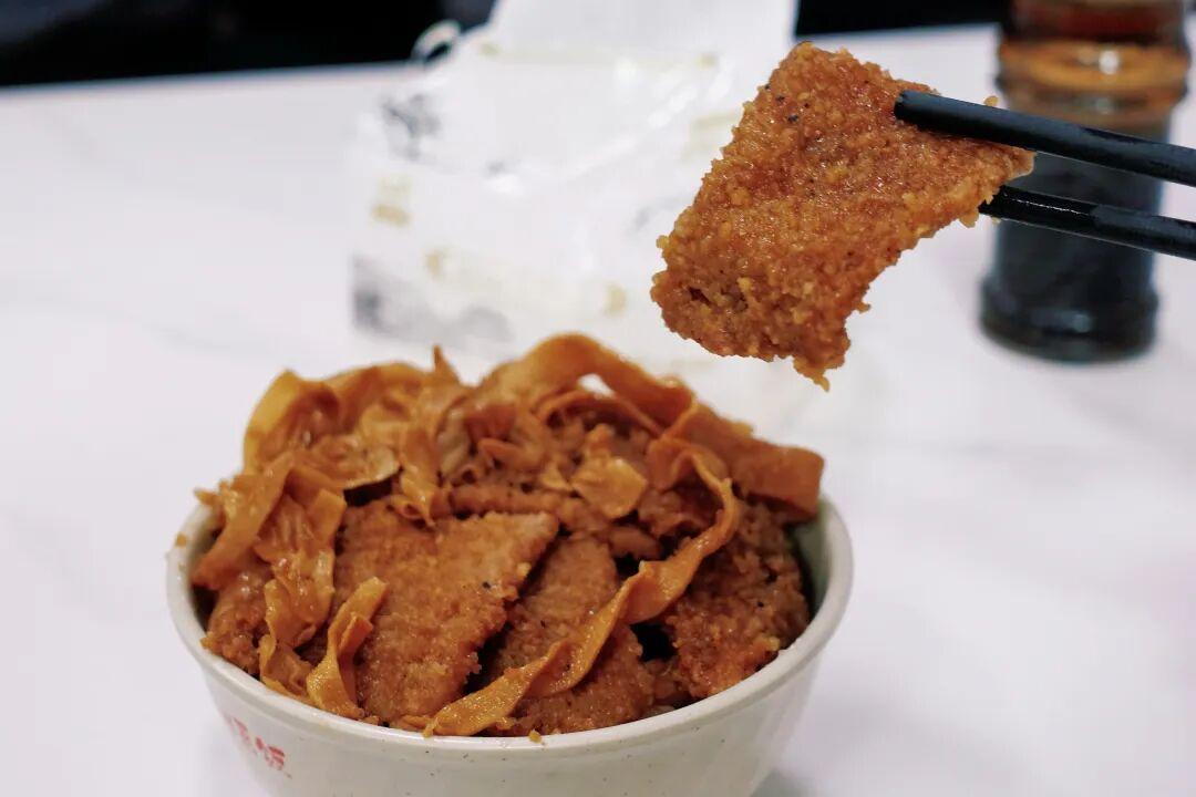 幾塊渣肉配千張,最後再在蒸熟的糯米飯上澆上一勺肉湯,看着一個小碗分量不多,但是絕對的頂飽。