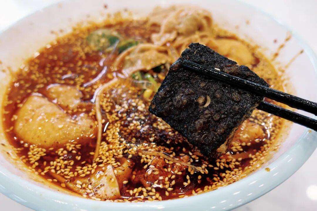小琴還有黑色臭豆腐,它就像洗碗海綿一樣能吸,一口咬下去能爆汁,香哦!