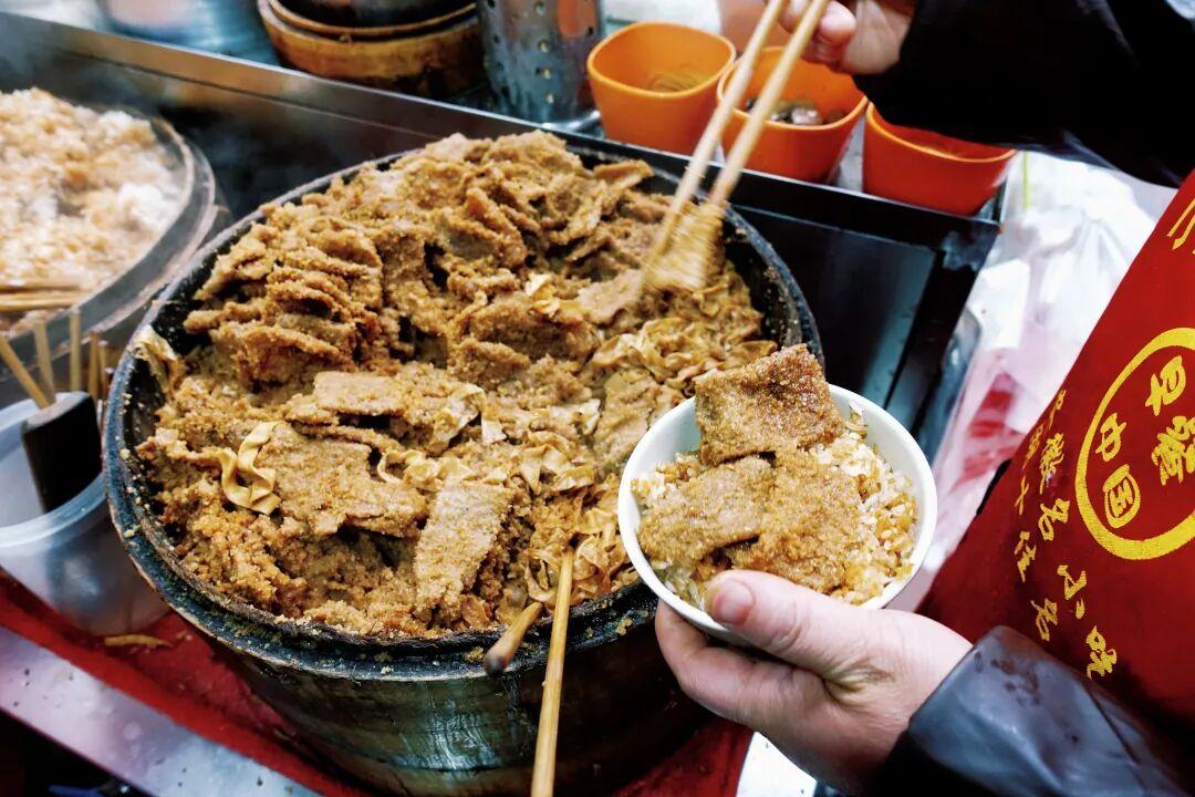 渣肉蒸飯是蕪湖很有代表性的一種小喫,通俗一點地說,就是粉蒸肉+糯米粉的組合。聽起來都是喫過的食物,但要做得好喫也不容易的。