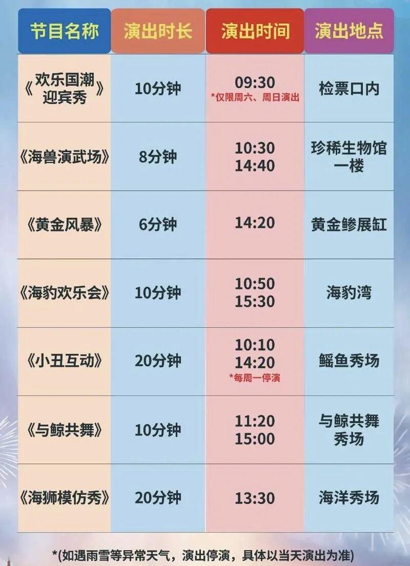 演出時間表我也貼一下,每日具體安排,大家可以在公衆號「蕪湖大白鯨海洋公園」上查看~