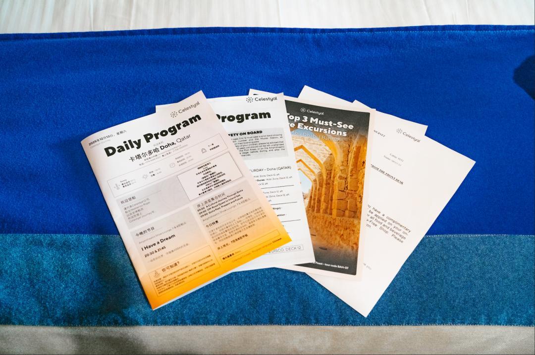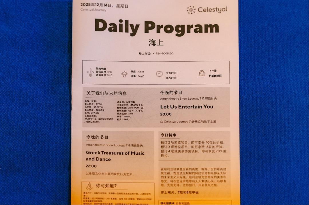 這份日程表裏詳列了所有活動安排、各港口抵離時間、岸上觀光詳情、各種公區的營業時間。每天睡前閱讀一下可以對後一天的行程有更好的把握。
