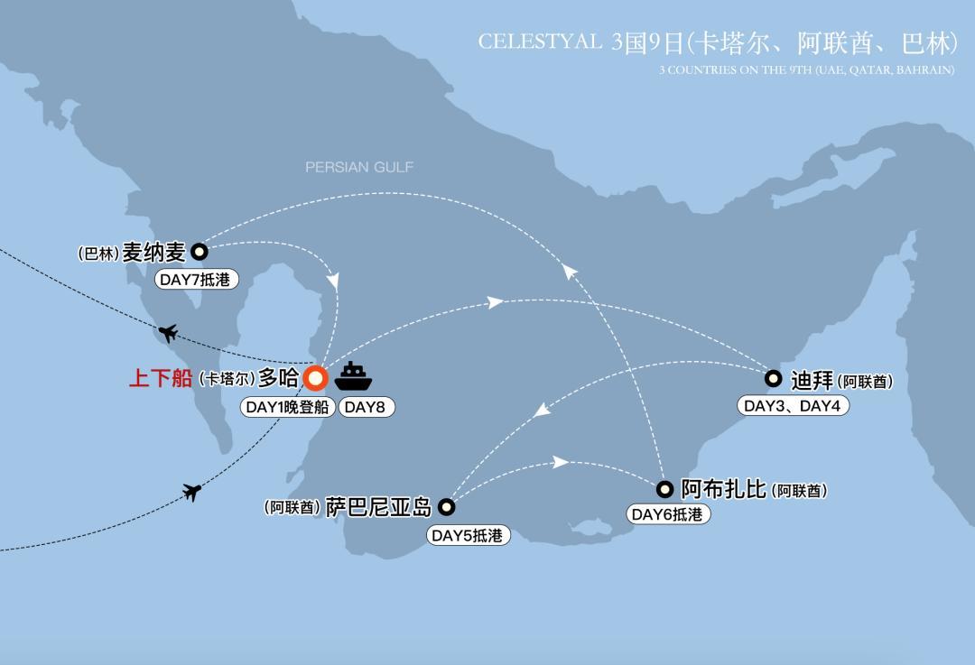其實這就是一個環線,多哈、迪拜、阿布扎比都能上船。這三個城市也都是大航點,直飛多、機票划算。