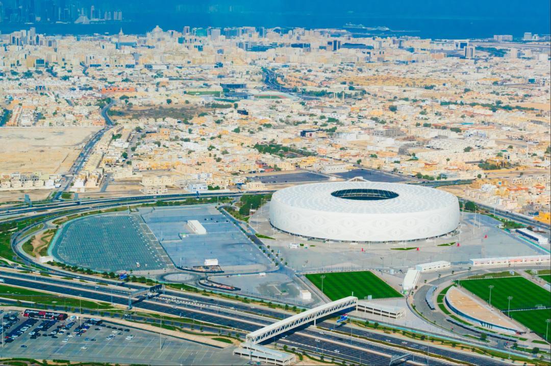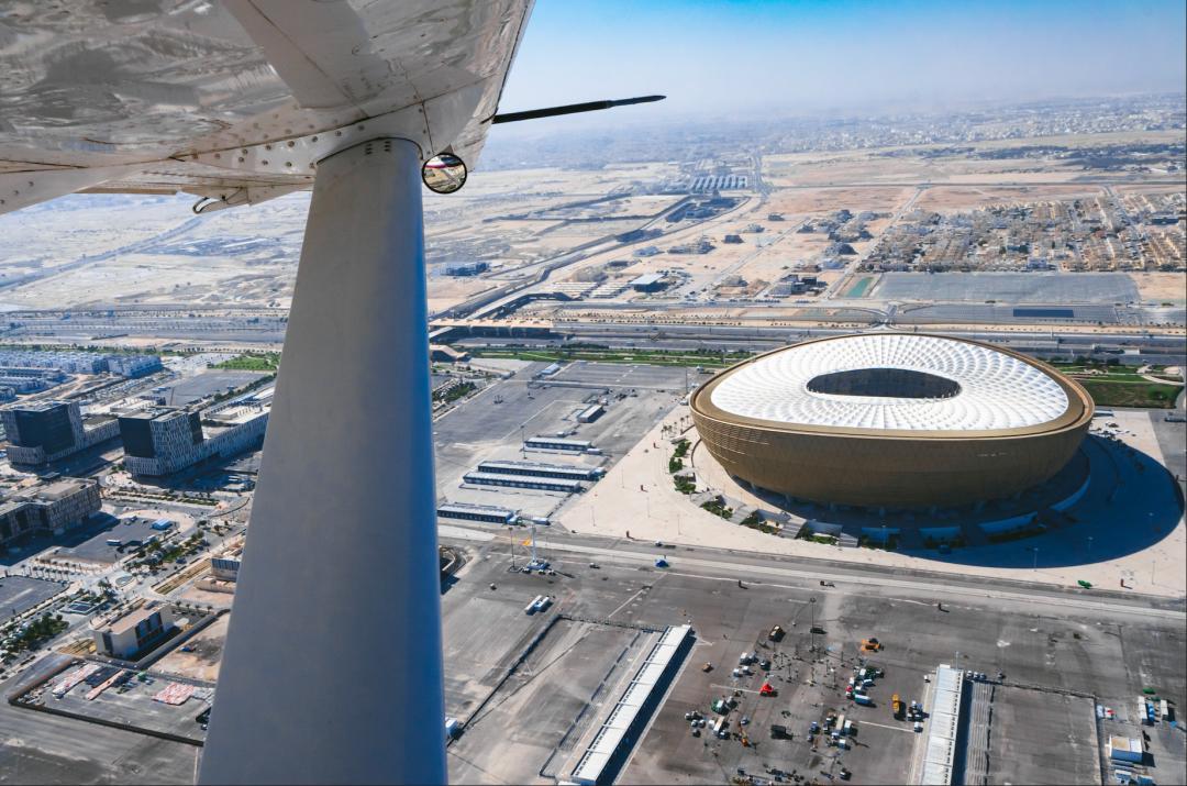 航線的重點是世界盃場館,從空中能清晰看到阿爾圖瑪瑪體育場的帳篷造型在致敬貝都因遊牧傳統,盧賽爾體育場的金碗紋樣源自阿拉伯傳統金屬工藝。