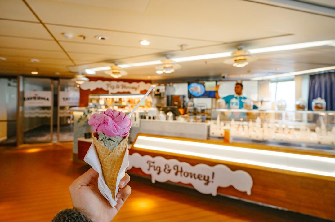 11層甲板的無花與蜜坊提供現做冰淇淋、法式馬卡龍、提拉米蘇等等。冰淇淋口感細膩且顏值高,很濃郁甚至能拉出絲。