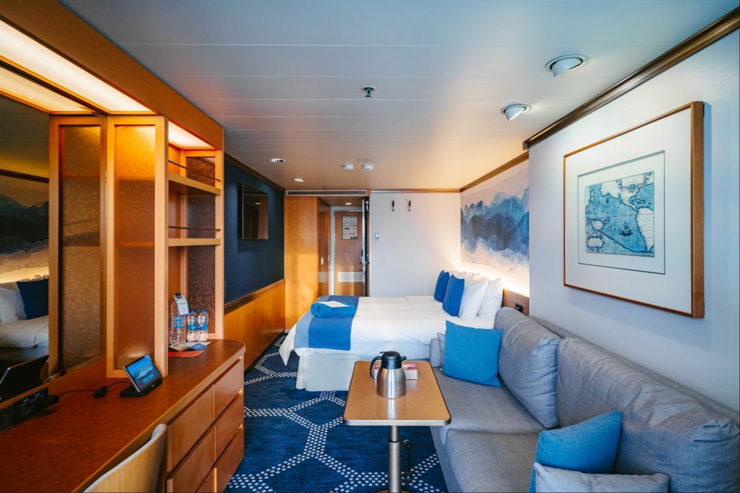 郵輪總噸位55877噸,船⻓219.3米,甲板層數14層,最大載客量1260人,共設630間客房。
