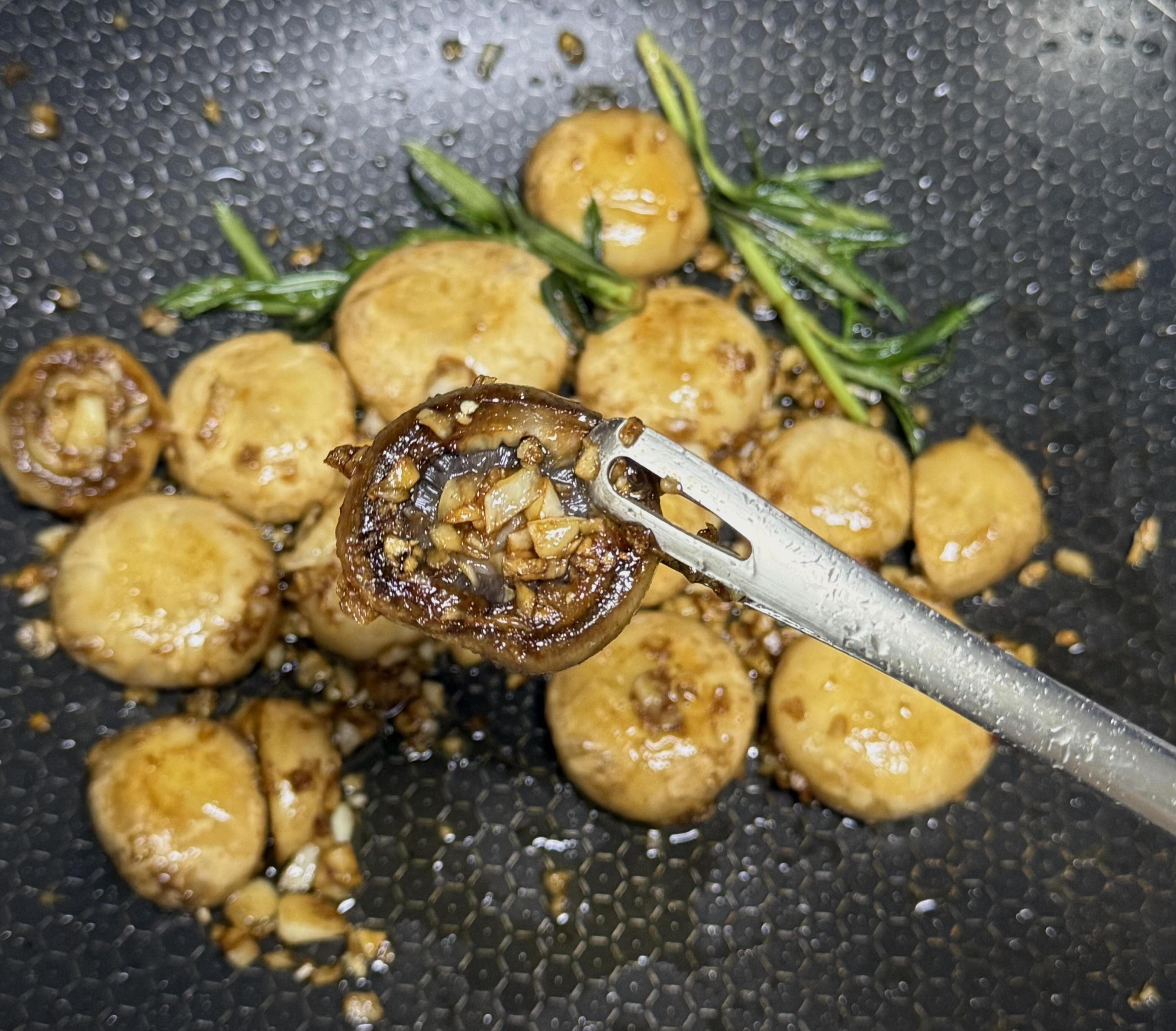 3、放入黃油塊,融化成金燦燦的油花,立刻倒入剁好的超多蒜末,快速翻炒出蒜香,加小半勺鹽、小半勺胡椒粉,再淋上1勺生抽提鮮,用鏟子輕輕翻拌,讓每顆口蘑都裹上醬汁,最後扔一小枝迷迭香,煎個30秒讓香氣融合,關火!