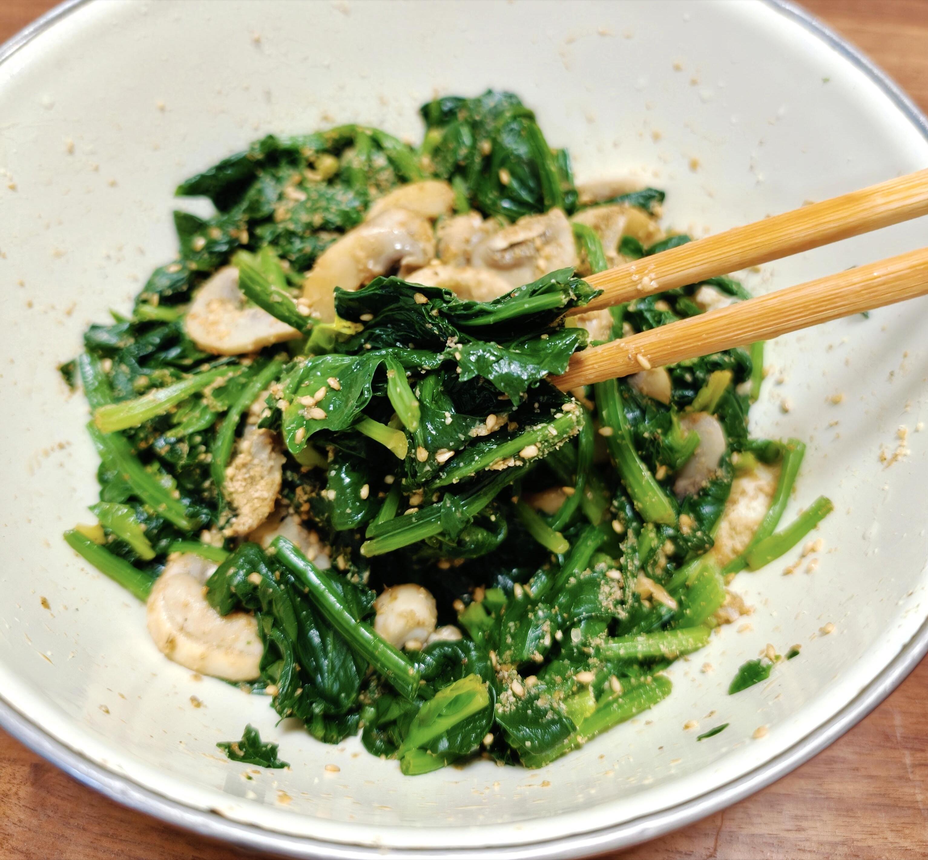 菠菜焯水後脆嫩,口蘑煎過帶着鮮甜味,芝麻鹽是靈魂,鹹香帶點顆粒感,單喫都很絕。5分鐘就能搞定,低卡又營養,打工人晚餐福音!