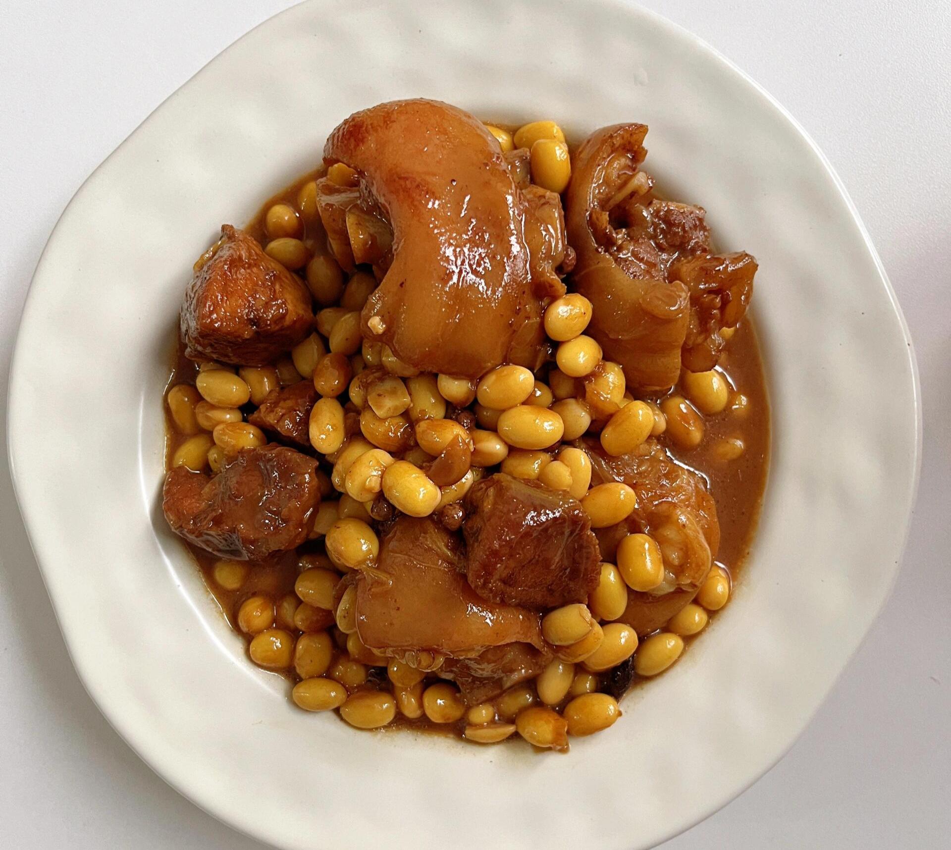 食材:豬蹄、黃豆、蔥、姜、蒜、幹辣椒、八角、花椒粒。