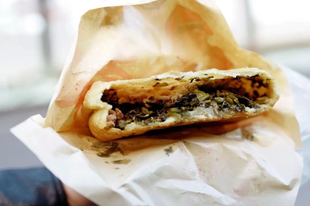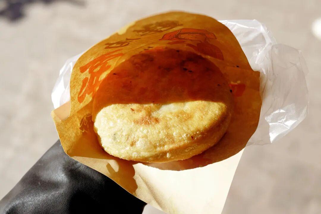 接過來咬一口,外皮焦脆,裏面軟韌,雪菜肉餡溼潤多汁。肉餡的汁水被面皮牢牢鎖住,咬開的瞬間在舌尖炸開,混着雪菜的鹹、鮮、甜、酸、香一層層鋪開,特別好喫。