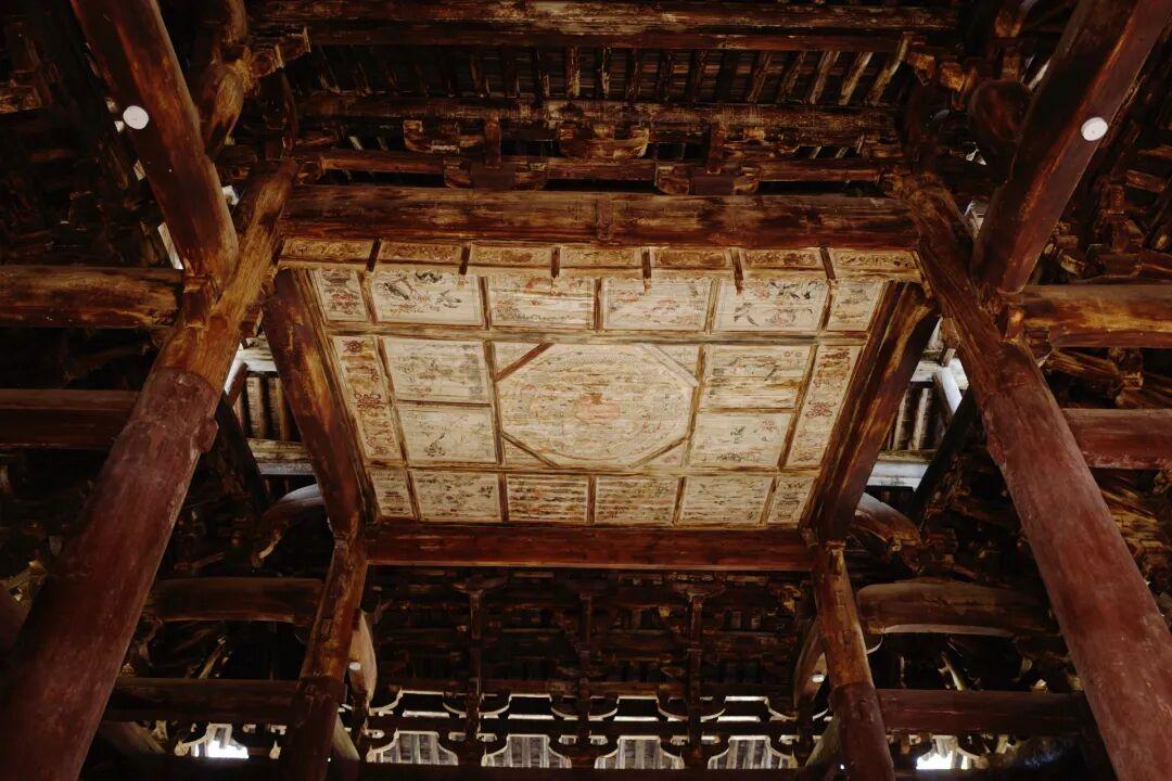 檐下的斗栱層層疊疊,如蓮花綻放,頂部正中天花粉底彩繪,無比精美。