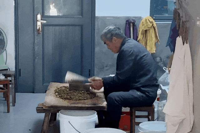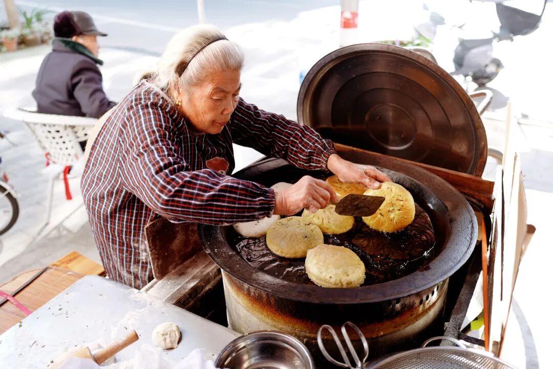 老奶奶一個人做餅煎餅,老伴在屋裏剁餡,鍋裏的油滋滋響着,現點現做,要稍微等一會的。