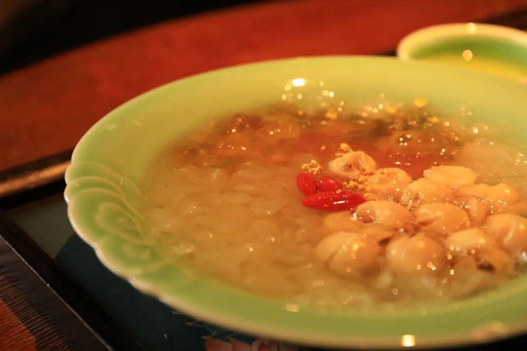 一碗甜湯裏面有蓮子、銀耳、桃膠等,最後還會撒一些幹桂花,喫起來清甜爽口。蓮子燉得很糯很香,作爲飯後甜點喫也很不錯。
