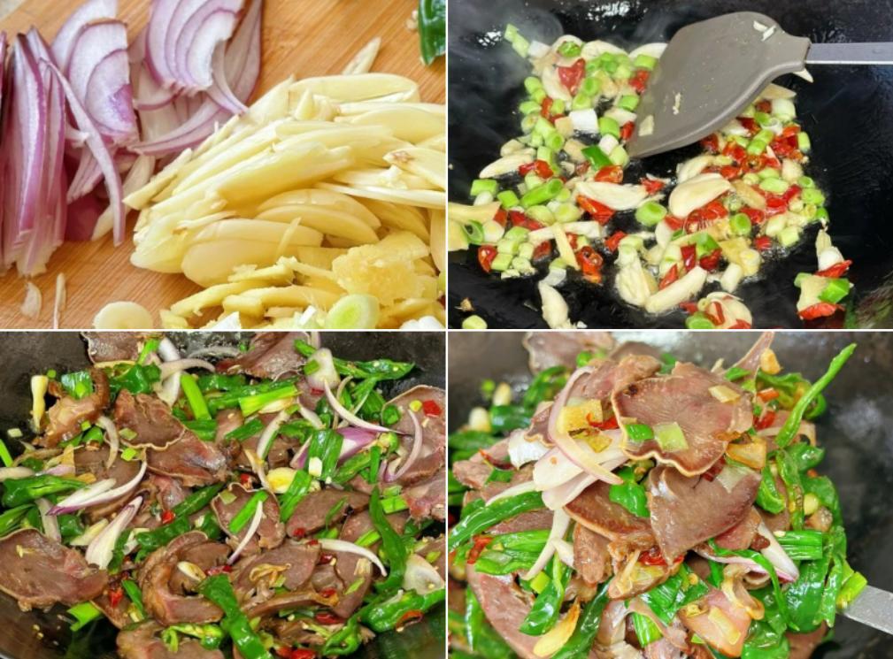 6. 小火爆香大蒜生薑蒜苗段幹辣椒碎,切好的豬舌頭肉和青紅辣椒洋蔥絲兒放進去一起快速翻炒兩三分鐘,加入適量鹽,雞粉,一勺薄鹽生抽,糖,出鍋前撒蒜苗段就可以啦!