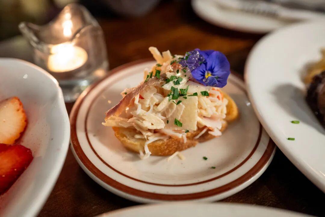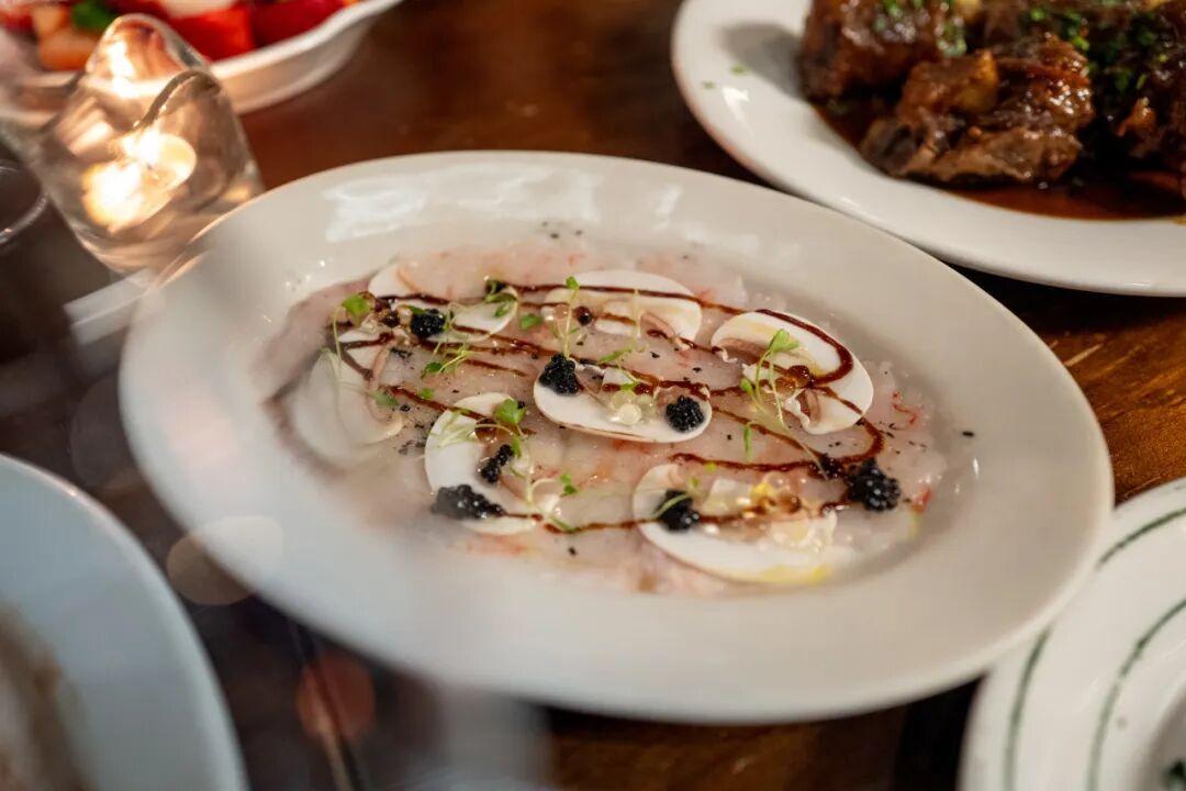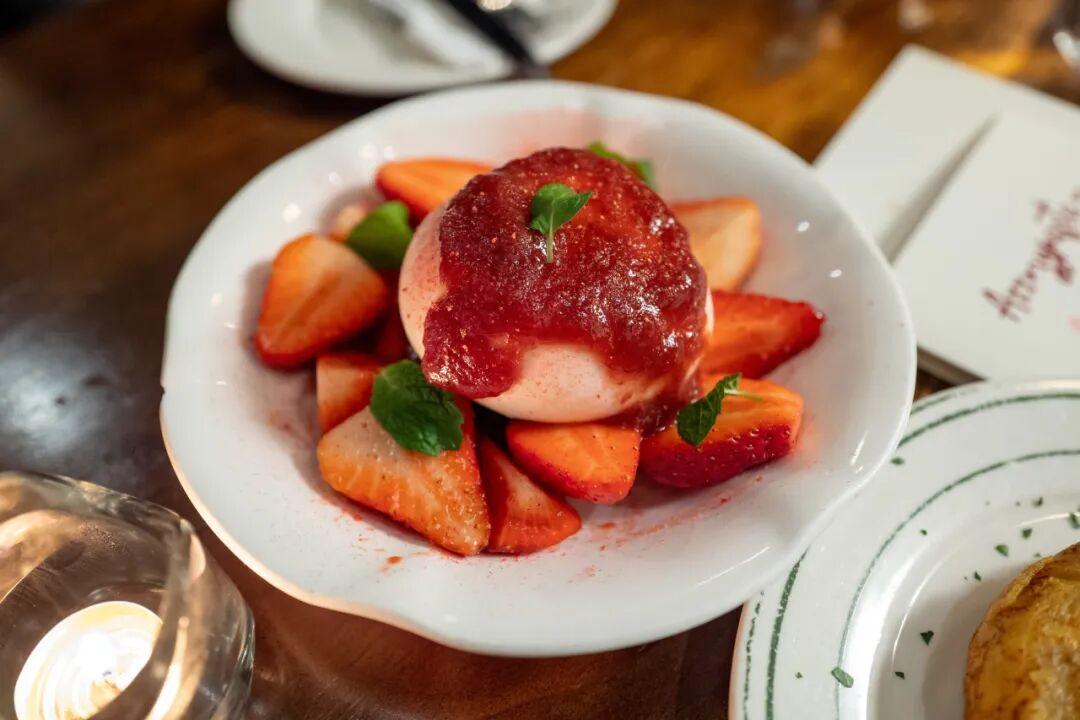 讓人眉飛色舞的兩道菜是丹東草莓布拉塔(時令菜),和甜蝦蘑菇薄片配松露魚子醬。