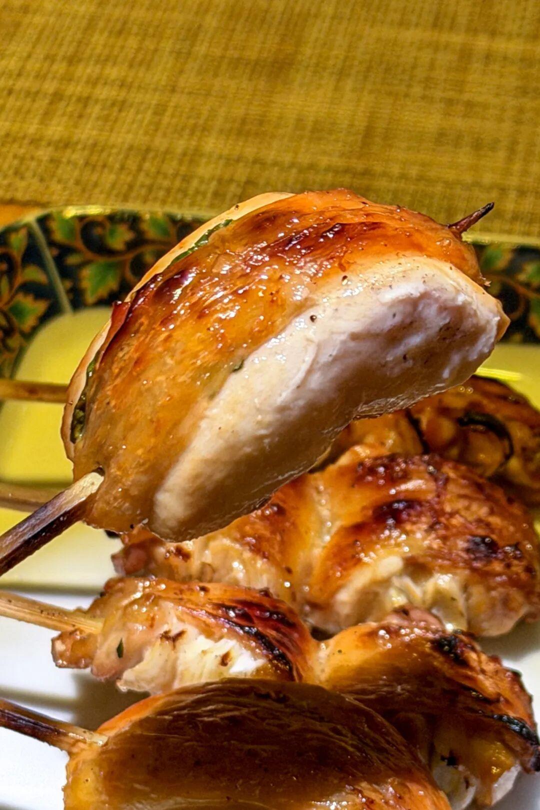 但我還是很推薦一石二鳥的,這家店的烤雞肉,真的有點東西。比如店家會把雞皮和雞肉拆分,在兩者間填入青蔥,再用竹籤嚴絲合縫地串在一起。