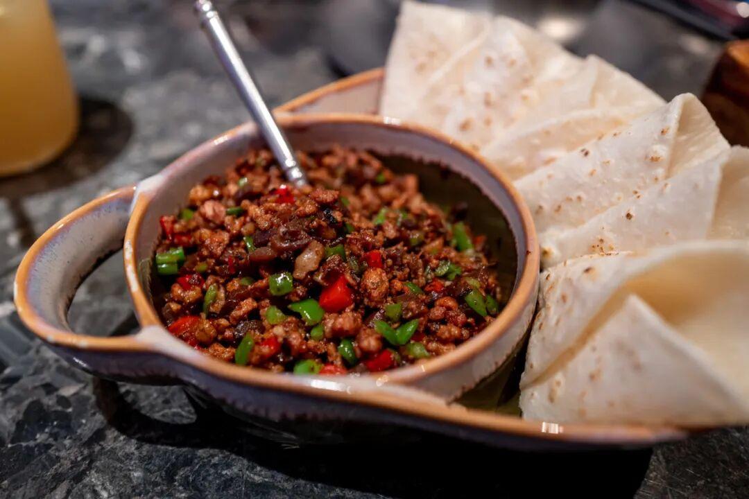 雖然是一家精釀吧,東河卻不侷限於做下酒菜。東河的菜單偏西式,沙拉、燴飯、披薩還有各種佐酒小食都可以點到,強推野蔥醬和牛拌飯。