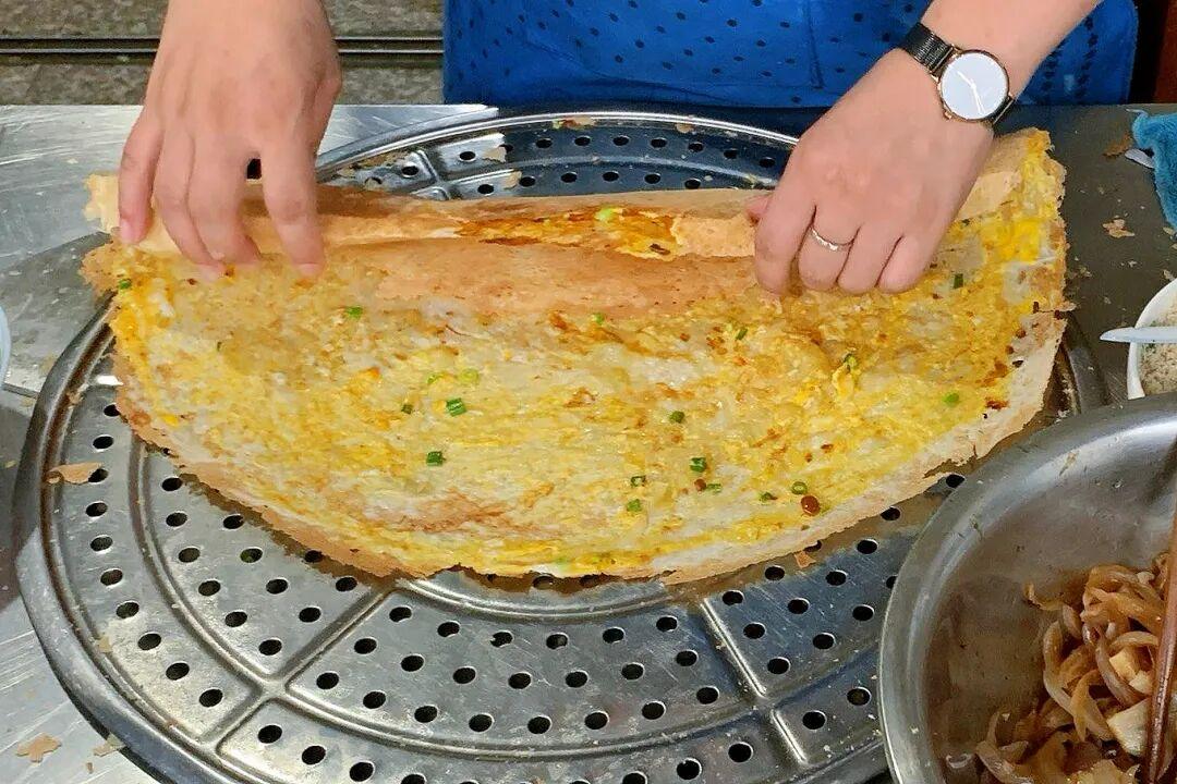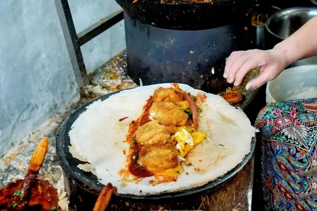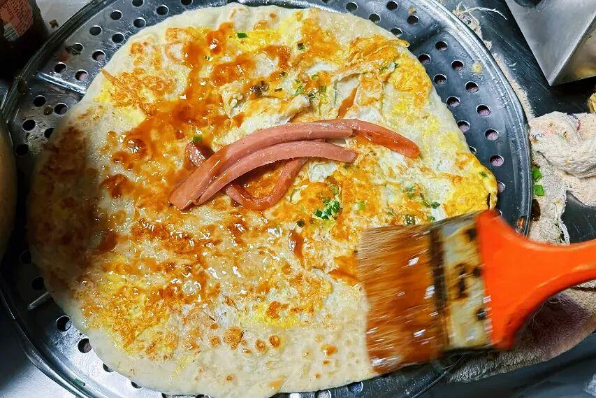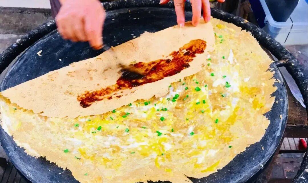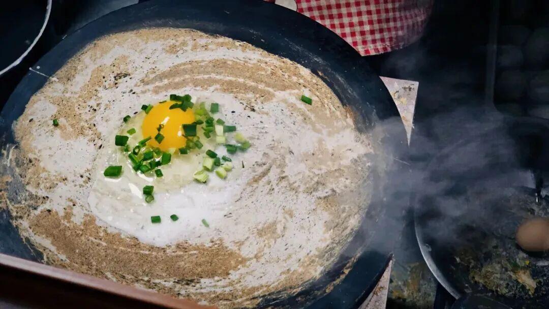 一勺麪糊往鑊裏一倒,手腕一轉,一張薄厚均勻的鑊拉頭就攤好了,打個雞蛋,撒上蔥花,煎得兩面金黃,邊緣焦脆。