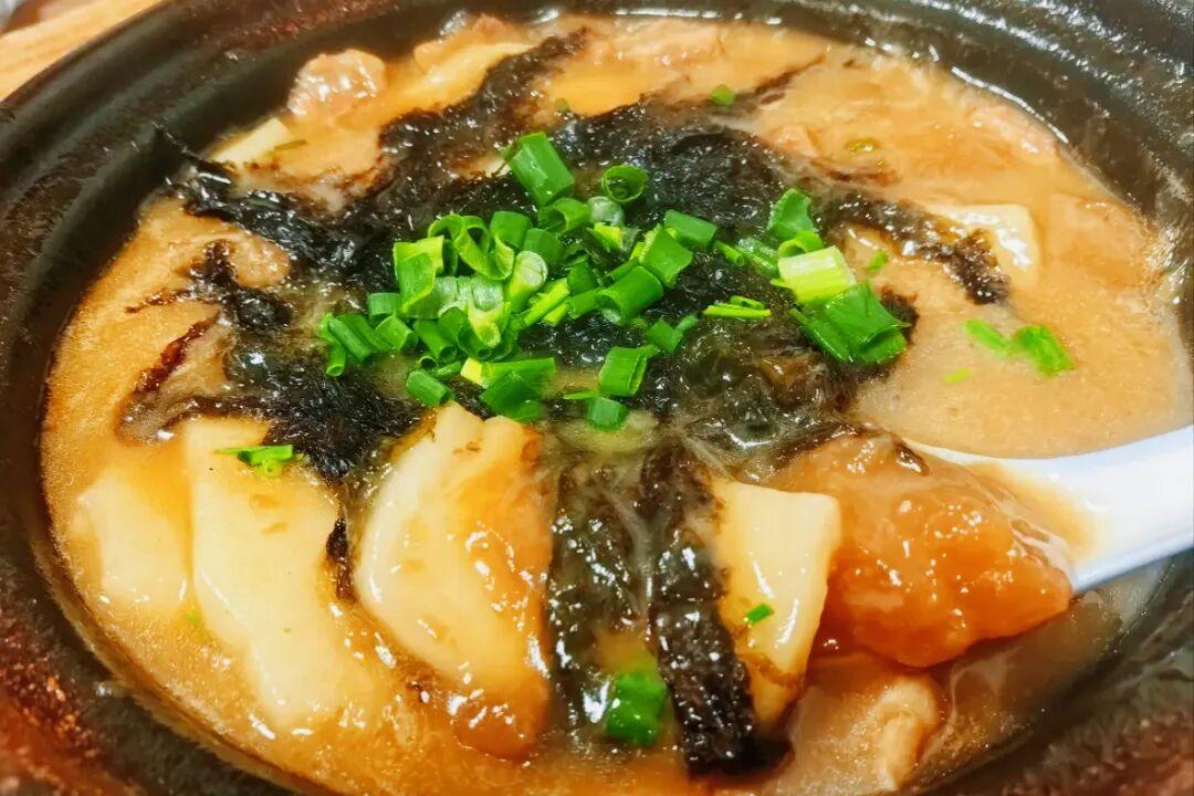年糕軟糯入味,大頭菜鮮爽提香,配上豬骨、紫菜煮一大碗,湯頭濃鮮,暖到胃裏。完全就是我是心中新昌夜宵的白月光。
