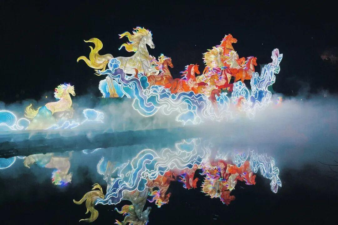 最壯觀的還是入口處的「萬馬奔騰」燈組,幾匹流光溢彩的駿馬在雲霧燈影里昂首奔騰,燈光一亮,新年的氛圍感直接拉滿,好多人在這兒駐足拍照,連我爸這種不愛湊熱鬧的人,都忍不住讓我給他拍了兩張。