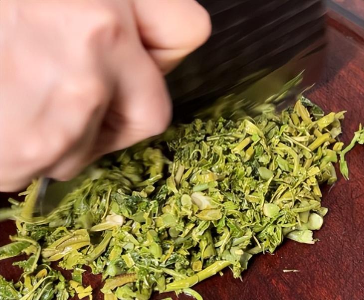 4、香椿擠幹水分之後,把它放到案板上切碎,喜歡入味的可以切的碎一些,喜歡喫香椿那麼可以不用那麼碎。