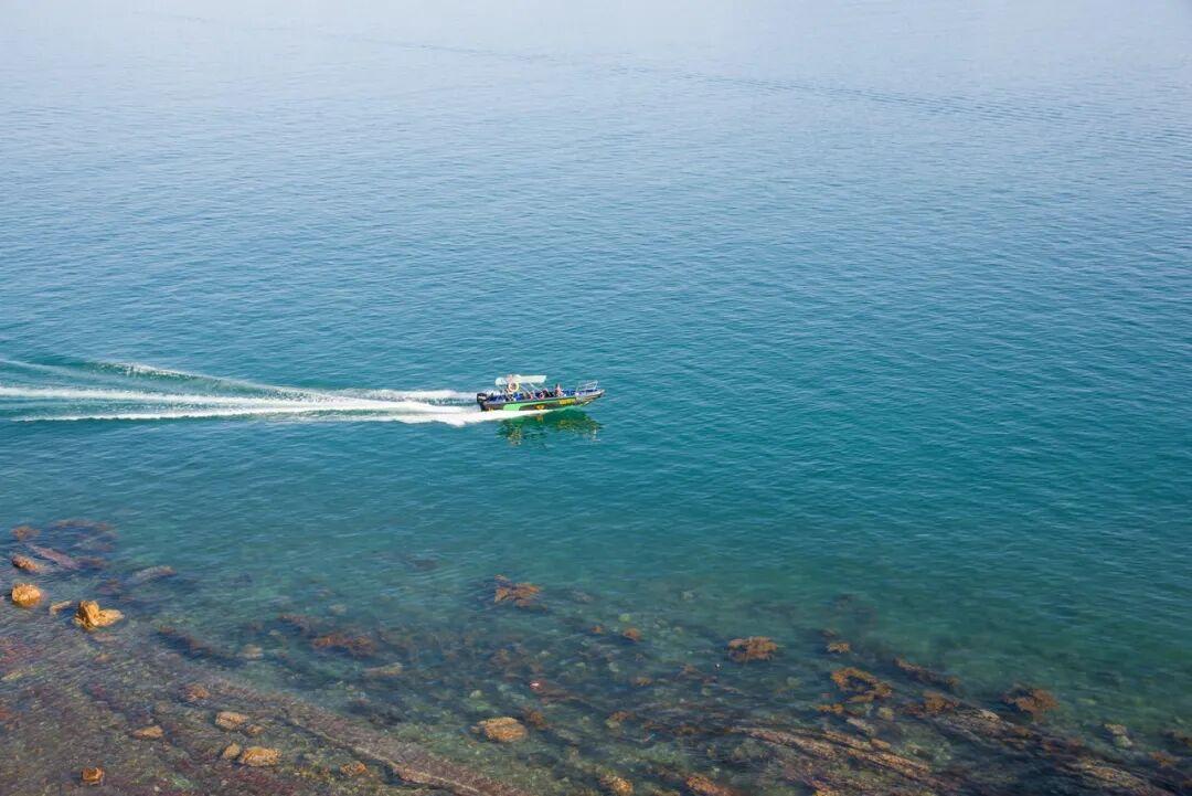 從停車場過去楊梅坑沙灘步行大概5分鐘,旁邊是快艇上車點,也是前往鹿嘴山莊最炫酷的方式。單程35元/人,往返60元/人。