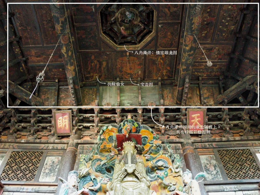 三絕:彩繪。殿宇天花板上繪有彩色壁畫五十幅;南廂房側山牆上另有一幅清康熙年間所繪的《百鳥朝鳳圖》,色澤至今仍然鮮豔;正殿供奉玉皇大帝,金童玉女侍立兩側。