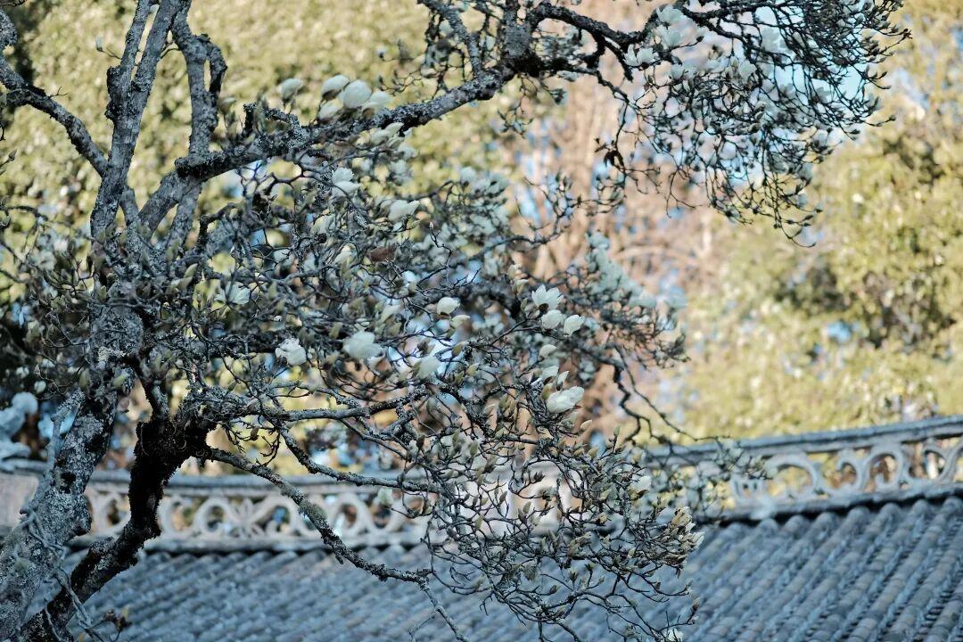 我去的時候,恰逢院內兩棵古玉蘭樹盛開的,顯得更加高雅。有一位在本地旅居的朋友告訴我,在巍寶山是可以和道長討茶喝的,當然也可以隨喜一些茶錢,喝的是山裏的野生茶。