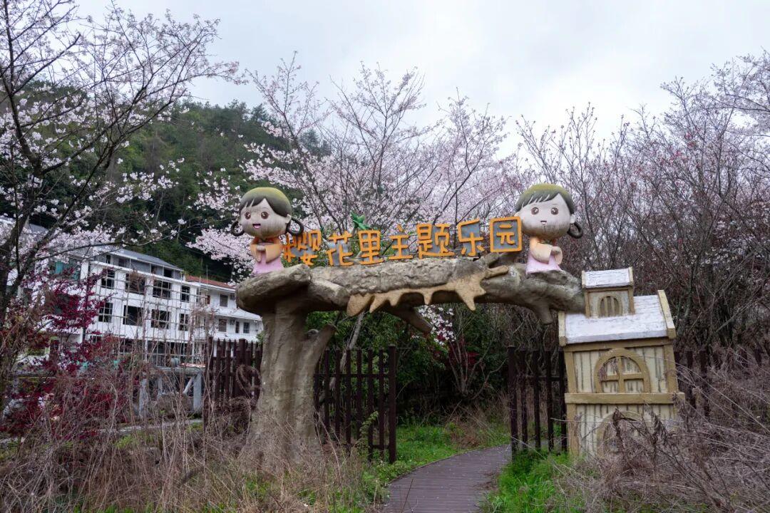 車行駛在斯宅村的路上,遠遠能看見一片櫻花園。羣山霧靄爲背景板,春日裏的櫻花開得張牙舞爪的。當時就想,嚯,這個地方我要來。