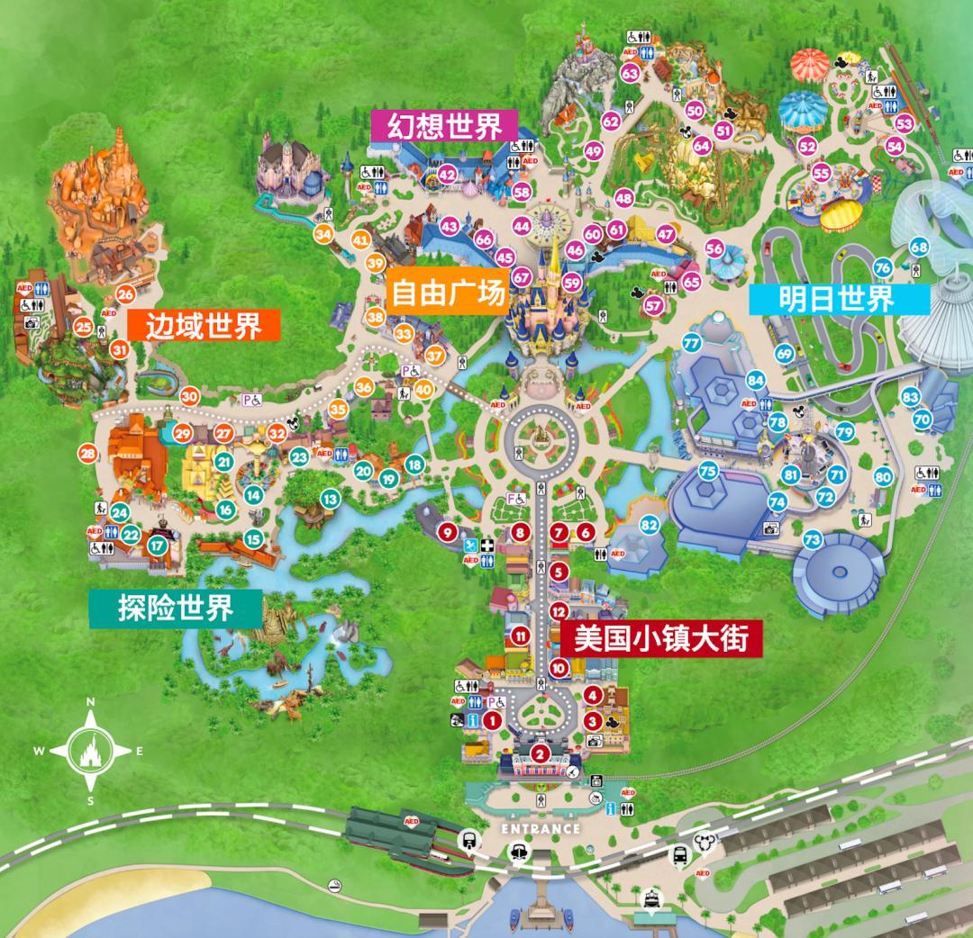 主要區域有:美國小鎮大街、探險世界、邊域世界、自由廣場、幻想世界、明日世界。