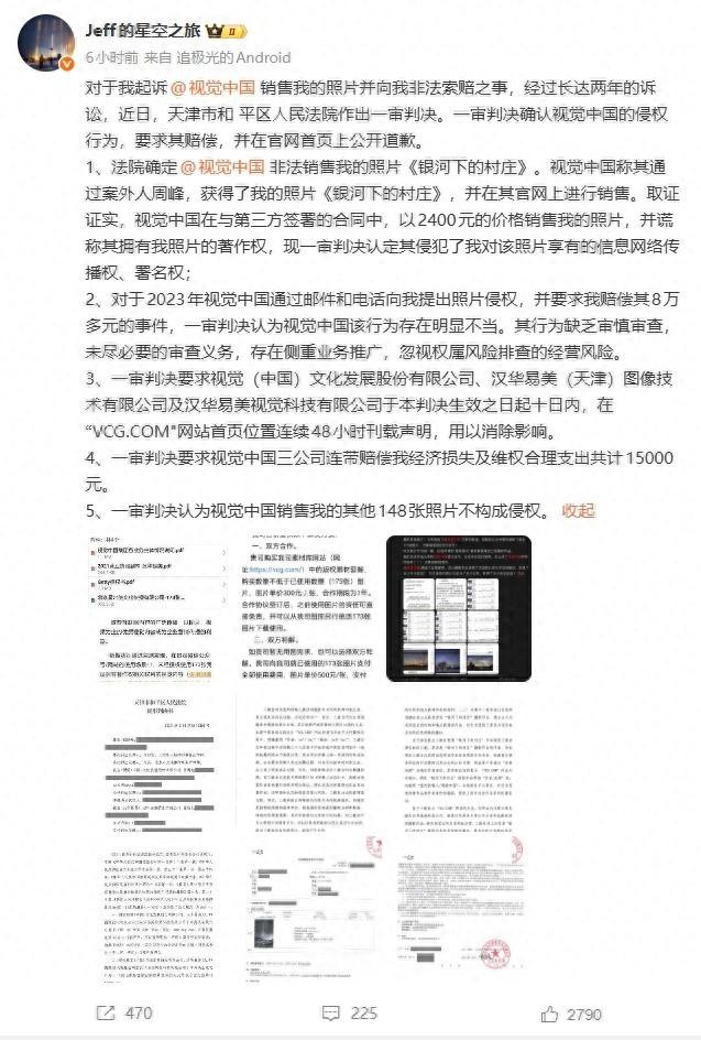 據瞭解,法院認定視覺中國銷售戴建峯作品“銀河下的村莊”構成侵權,要求其賠償戴建峯維權成本及損失共計15000元,並在網站首頁發佈聲明消除影響。