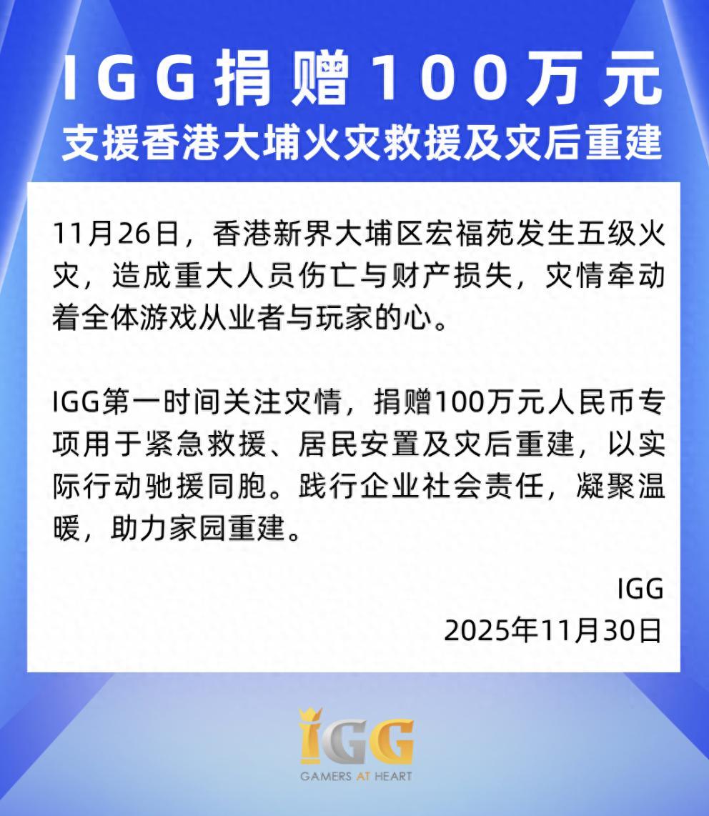 11月26日,香港新界大埔區宏福苑發生五級火災,造成重大人員傷亡與財產損失,災情牽動着全體遊戲從業者與玩家的心。