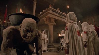 而後者,則可以從宗教行爲中辨別。“拜火”正是絲綢之路上粟特商旅的信仰特徵,而神廟鏡頭中的帶翼塑像,也與“拜火教”神像的造型相契合。