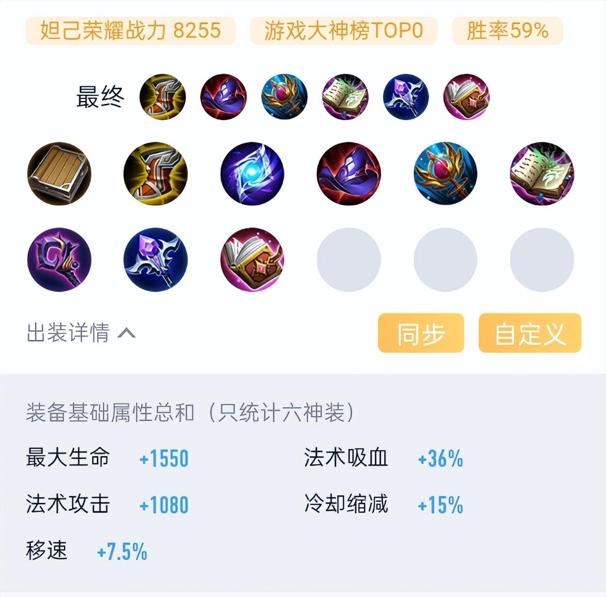 - 賢者之書:傷害質變裝!400 法攻 + 1400 生命值,既加傷害又撐血,讓妲己後期能抗能打;