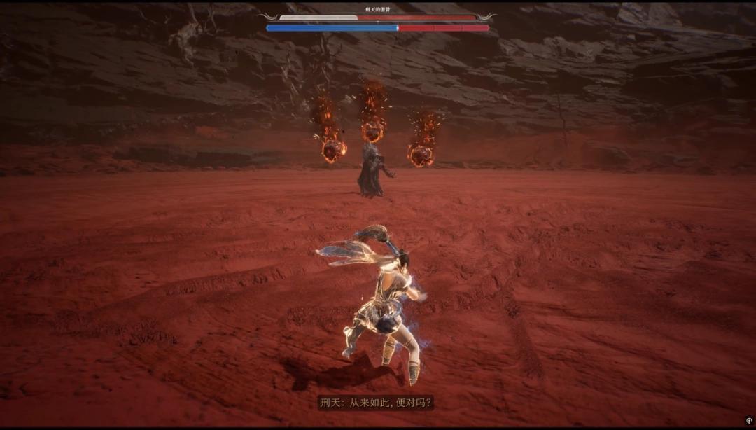 同時,這些法寶之間的相生相剋關係,也非常符合我們最原始的,對“神仙打架”中“法寶對抗”環節的想象。比如,預告片中主角使用疑似芭蕉扇的“法寶”,扇滅了刑天捲起的龍捲風,便是這種想象的直觀呈現——有趣的是,此前在《黑神話:悟空》中,每個關卡都能找到對BOSS形成天然剋制的隱藏法寶,所使用的也是這套邏輯,只不過在《古神:風裏希》中,這種剋制關係會出現得更爲頻繁。